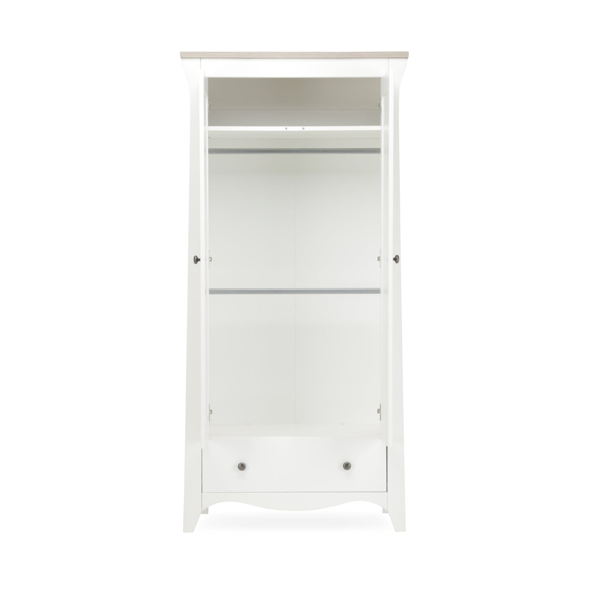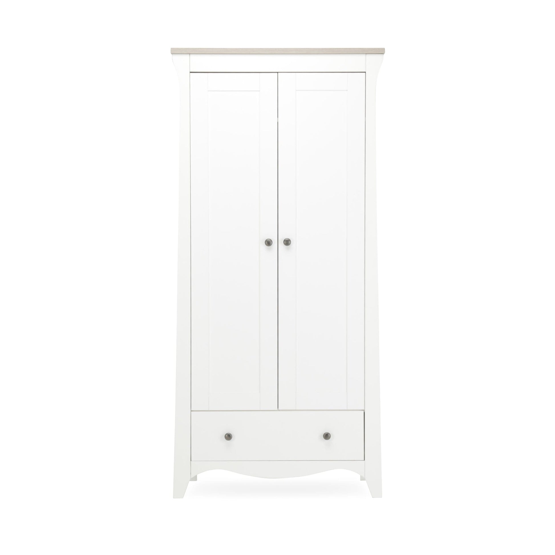 The Clara 2 door double wardrobe is designed to successfully organise your nursery, with 2 removable hanging rails to convert into a full-size wardrobe, a deep storage drawer and handy shelving space, it's classic styling to transform a modern nursery.